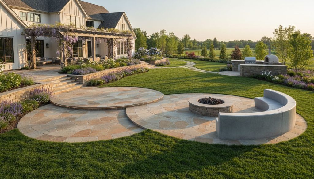 Beyond standard patios, we specialize in custom features like built in fire pits, outdoor kitchens, and decorative seating walls. These elements turn a simple backyard into a luxury destination where you can host guests year round. We carefully consider the placement of these structures to maximize views and ensure safety relative to your home. Each feature is custom built to match the existing aesthetic of your property, creating a unified look that feels intentional and high end.